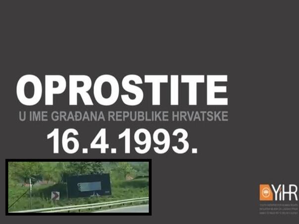 Prelijepljen je plakat koji je Inicijativa mladih za ljudska prava, uoči godišnjice stravičnog zločina u Ahmićima, na ulazu u ovo selo postavila sa porukom: “Oprostite u ime građana Republike Hrvatske, 16.04.1993.”