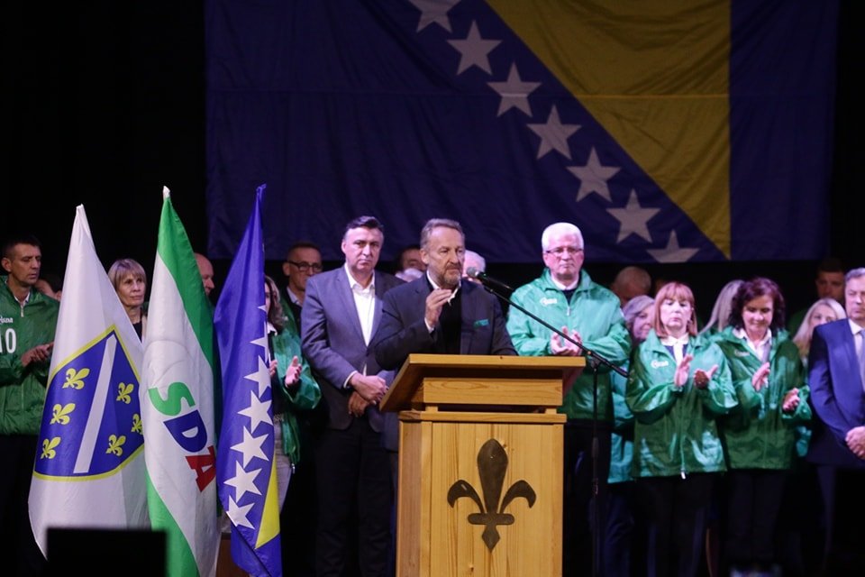 • Ili ćemo imati najtežu krizu ili ćemo imati najveći uspjeh. Pozivamo sve u BiH da uradimo ovo drugo, da budemo razumni i odgovorni, te da pokrenemo zemlju kao nikada do sada. Tražimo 350.000 glasova za SDA. Pojačajte motor koji sve vrijeme vuče zemlju u pravom smjeru. Zauzvrat garantujemo mir, sigurnost, izgradnju infrastrukture, borbu protiv korupcije kakvu do sada niste vidjeli, reformski put. Rezultat svega toga će biti 50 posto više plaće i penzije do kraja mandata – izjavio je Izetbegović.