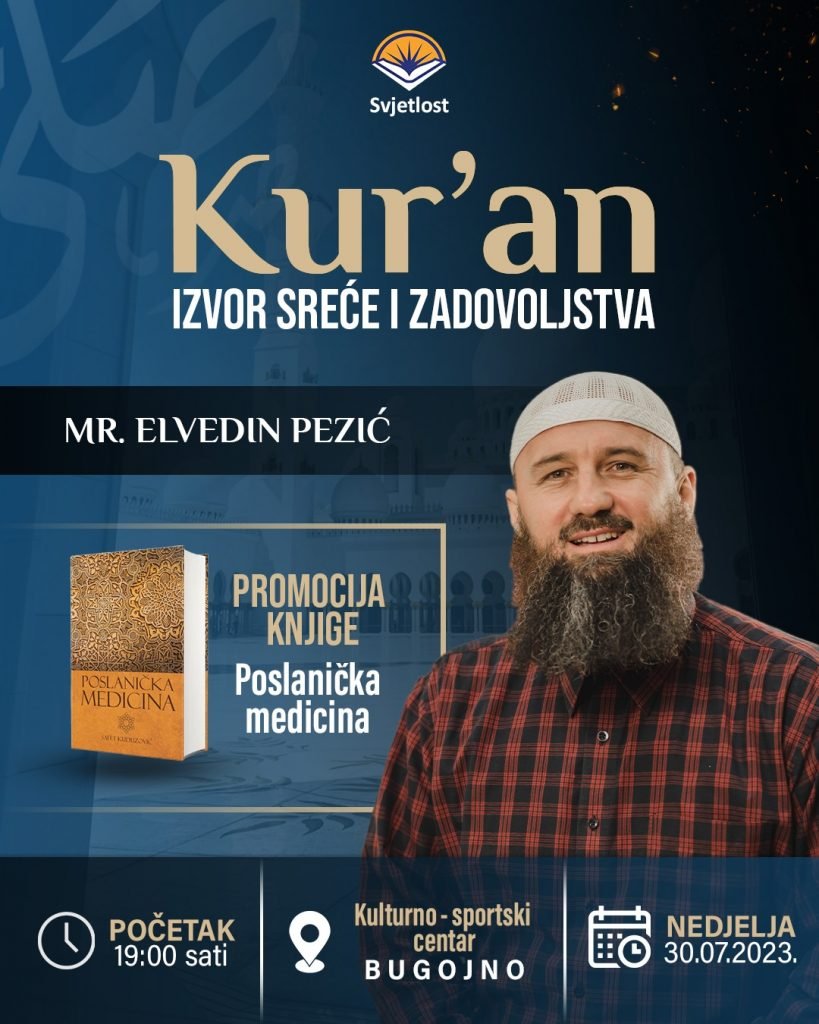 U nedjelju, 30.07.2023. godine u 19.00 h u Pozorišnoj dvorani KSC-a Bugojno Udruženje građana Svjetlost Bugojno organizuju predavanje na temu “Kur`an izvor sreće i zadovoljstva” predavača mr. Elvedina Pezića.