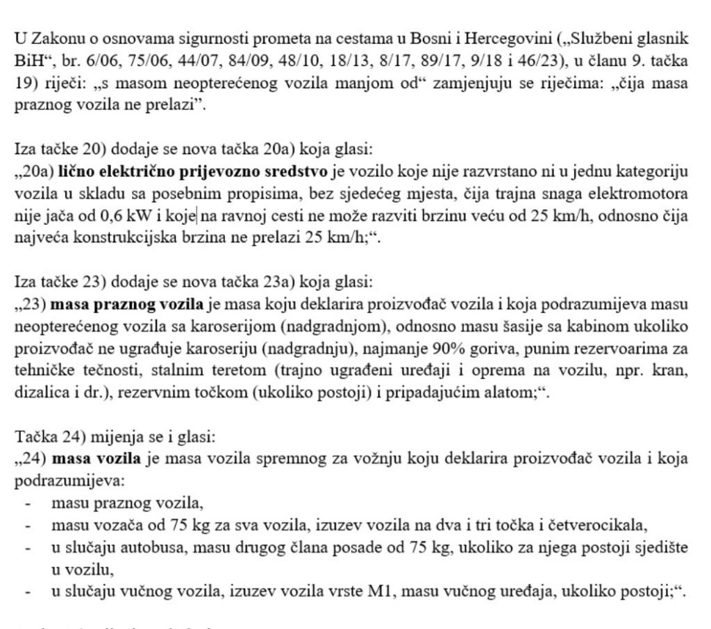 Okončan je rad na novom Prednacrtu zakona o izmjenama i dopunama Zakona o osnovama sigurnosti prometa na cestama u Bosni i Hercegovini. Ovo je jedna u niz izmjena krovnog zakona o saobraćaju, a Fokus.ba donosi detalje novih izmjena navedenog zakonskog rješenja koji će se uskoro naći na sjednici Vijeća ministara BiH U obrazloženju se navodi da se svrha donošenja Zakona temelji na potrebi prevazilaženja uočenih nedostataka u implementaciji postojećeg zakonskog rješenja, kao i potrebe preciznijeg definisanja određenih važećih zakonskih odredbi. Također, Prednacrtom zakona predviđaju se novine u postupku produženja registracije vozila te se reguliše kretanje ličnog električnog prijevoznog sredstva (lakih ličnih električnih vozila) na putevima. Električni romobili Dodatno, predloženim izmjenama i dopunama, za određene prekršaje propisuju se oštrije sankcije u odnosu na važeći Zakon. Predmetni Prednacrt zakona ima za cilj unapređenje stanja sigurnosti ali i postizanja specijalne i generalne prevencije. Tako se u zakon dodaje odredba koja definira lično električno prijevozno sredstvo (romobili) a to je, prema ovoj odredbi, vozilo koje nije razvrstano ni u jednu kategoriju vozila u skladu sa posebnim propisima, bez sjedećeg mjesta, čija trajna snaga elektromotora nije jača od 0,6 kW i koje na ravnoj cesti ne može razviti brzinu veću od 25 km/h, odnosno čija najveća konstrukcijska brzina ne prelazi 25 km/h. Ličnim električnim prijevoznim sredstvom smije upravljati lice koje je navršilo 14 godina.