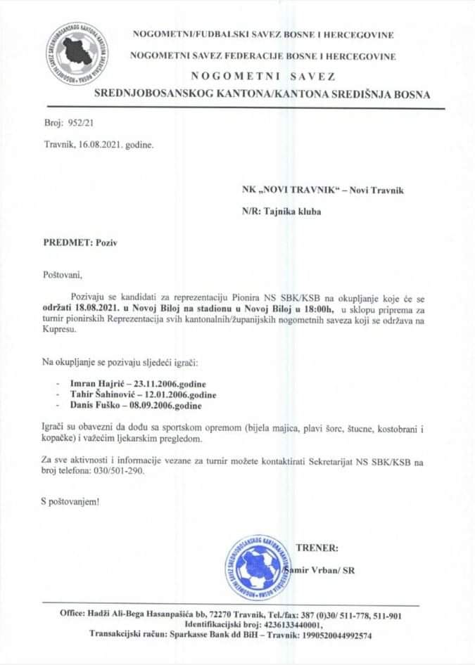 Mladi fudbaleri talenti Novog Travnika, Imran Hajrić, Tahir Šahinović i Danis Fuško (2006. godište) pozvani su u reprezentaciju pionira NS SBK.