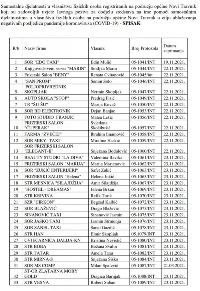 Dana 07.12.2021 god. načelnik Općine Novi Travnik Stjepan Dujo potpisao je Odluku o isplati sredstava na ime jednokratne pomoći samostalnim djelatnostima u vlasništvu fizičkih osoba registriranih na području općine Novi Travnik u cilju ublažavanja negativnih posljedica pandemije koronavirusa (COVID-19).