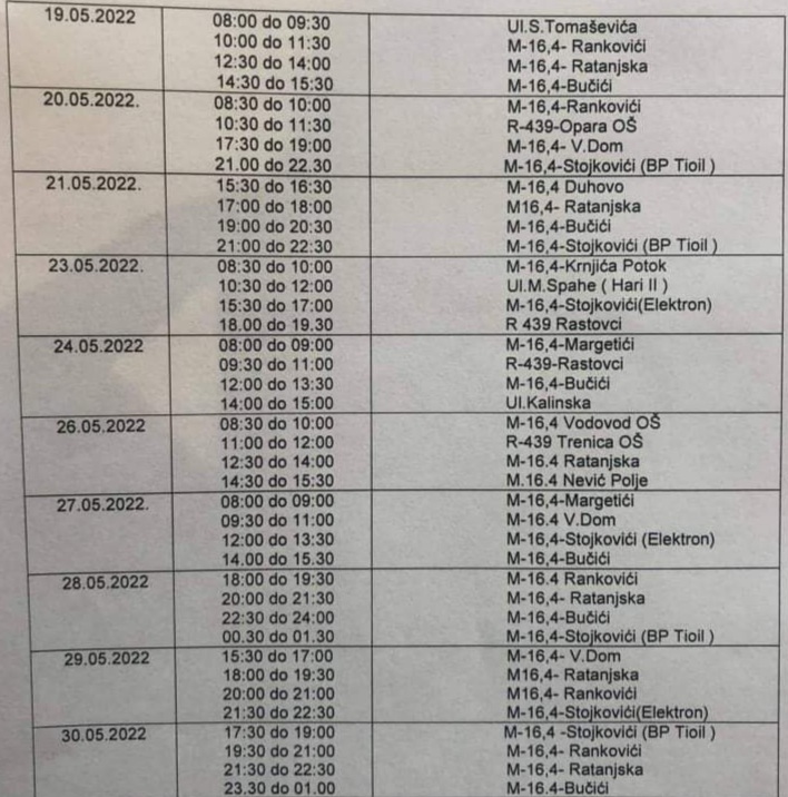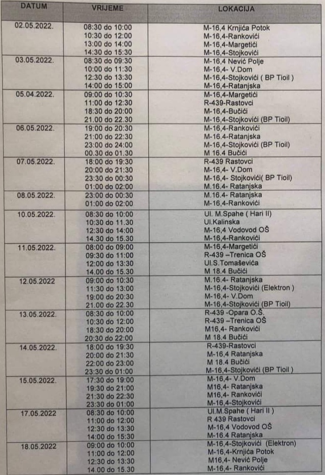 U nastavku kompletan raspored dnevnih i noćnih radara za područje općine Novi Travnik za mjesec maj.
