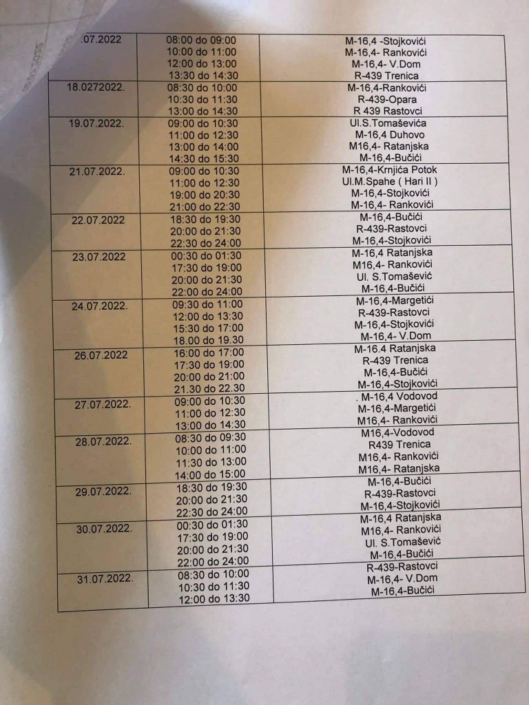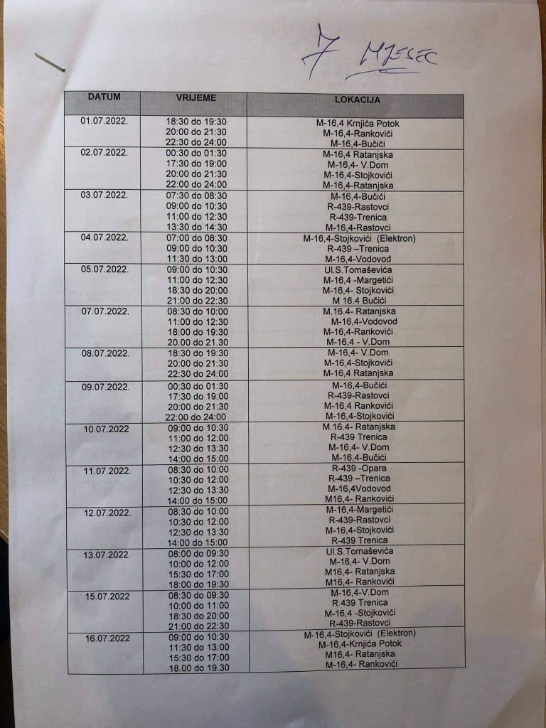 U prilogu kompletan spisak dnevnih i noćnih radara za mjesec jul, za područje Novog Travnika.