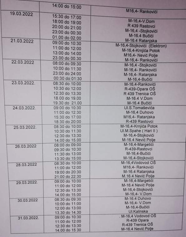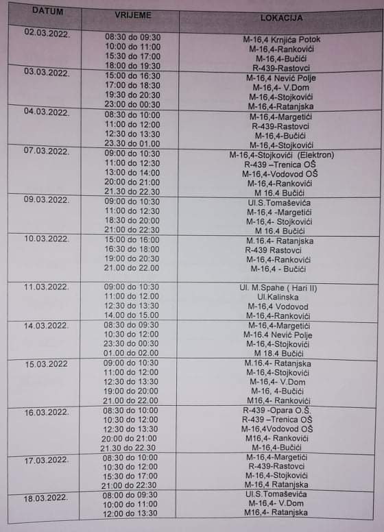 U prilogu kompletan spisak dnevnih i noćnih radara za mjesec mart 2022. godine za područje općine Novi Travnik.