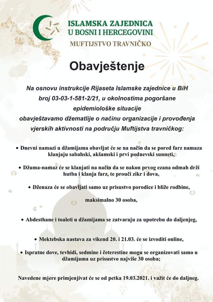 Na osnovu instrukcije Rijaseta Islamske zajednice u BiH, u okolnostima pogoršane epidemiološke situacije obavještavaju se džematlije na području Muftijstva travničkog.