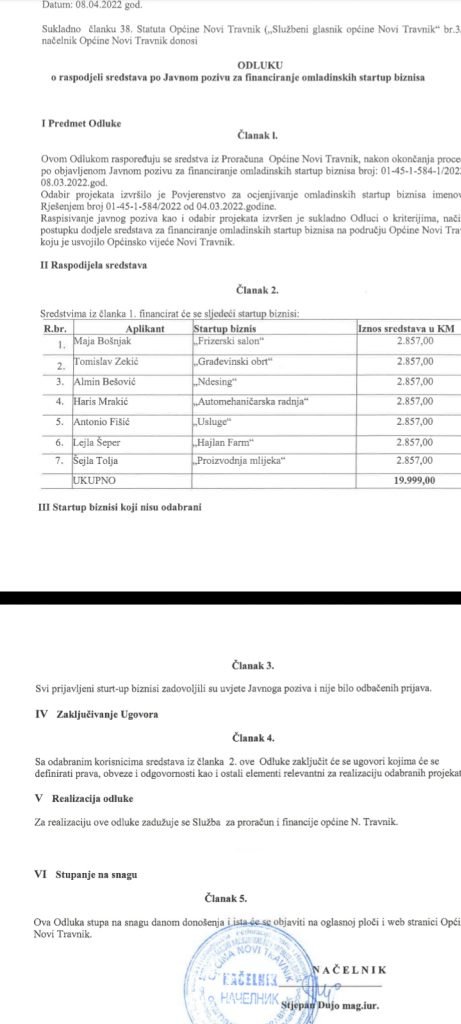 Na temelju utvrđenih kriterija donijeta je i Odluka o raspodjeli sredstava po Javnom pozivu za financiranje omladinskih startup biznisa.