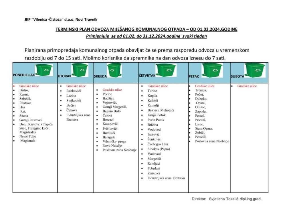 JKP „ Vilenica -Čistoća“ d.o.o. Novi Travnik obavještava korisnike svojih usluga da od 1. februara ove godine počinje primjena novog rasporeda odvoza miješanog komunalnog otpada na području općine Novi Travnik.