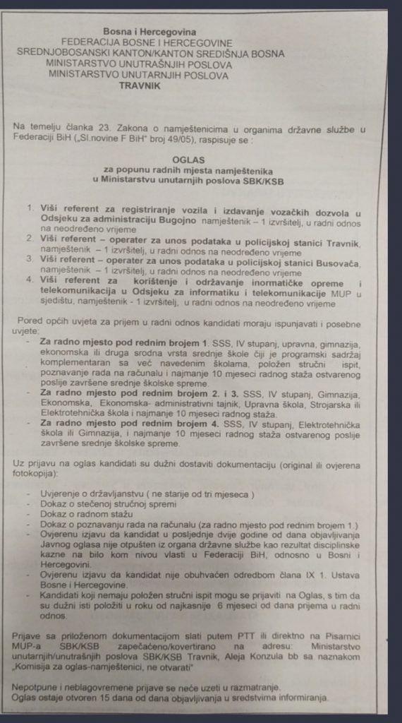Ministarstvo unutarnjih poslova Srednjobosanskog kantona raspisalo je oglas za prijam četiri namještenika. Oglas, kojega prenosimo u nastavku, ostaje otvoren petnaest dana od dana objavljivanja u sredstvima javnog informiranja.