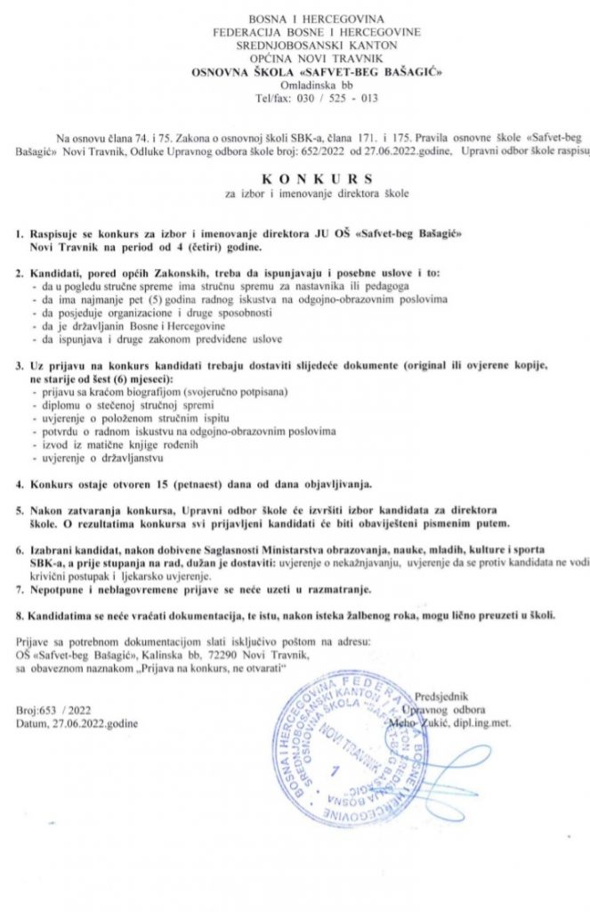 Upravni odbor osnovne škole “Safvet-beg Bašagić” Novi Travnik raspisuje konkurs za prijem i imenovanje direktora škole.