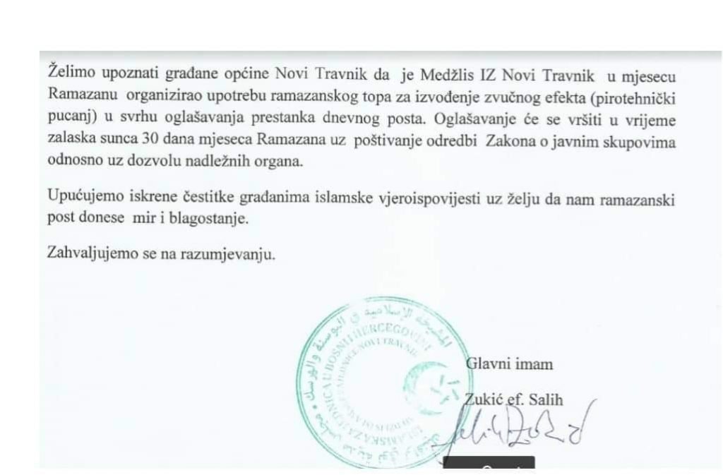 Iz Medžlisa IZ Novi Travnik obaviještavaju građane kako će ove godine za vrijeme mjeseca ramazana u upotrebi biti ramazanski top koji će oglašavati prestanak dnevnog posta, tj. vrijeme iftara.