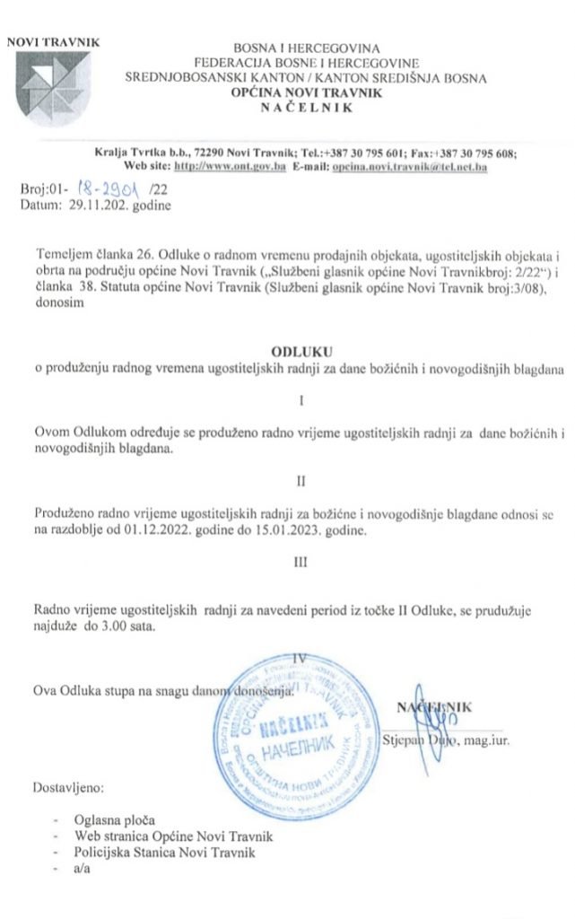 Načelnik Općine Novi Travnik na temelju Odluke o radnom vremenu prodajnih objekata, ugostiteljskih objekata i obrta na području općine Novi Travnik donio je Odluku o produženju radnog vremena ugostiteljskih radnji za dane božićnih i novogodišnjih praznika.