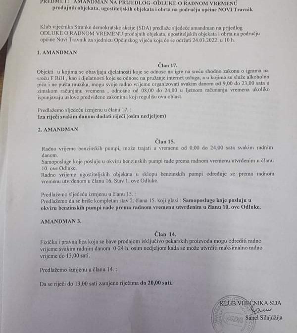 SDA Novi Travnik će uložiti nekoliko amandmana na ovu odluku, a koji se odnose na rad kladionica, pekara, te samoposluga koje djeluju u okviru benzinskih pumpi.