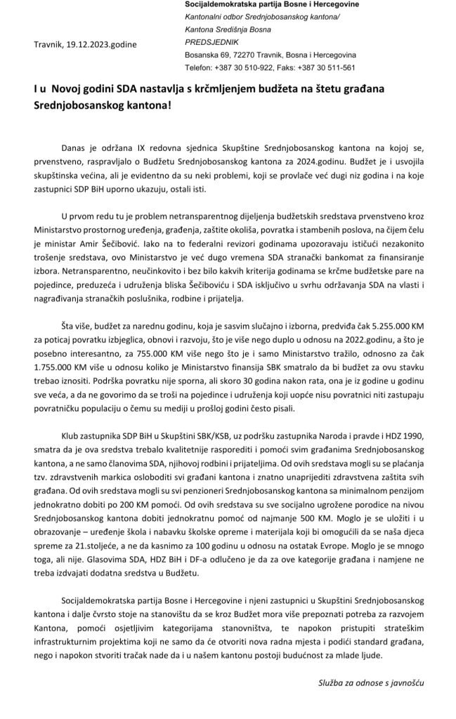Iz opozicije ipak nisu zadovoljni sa načinom na koji će biti utrošena i raspoređena sredstva iz budžeta kantona za iduću godine, a tim povodom saopćenje je uputio KO SDP BiH SBK: