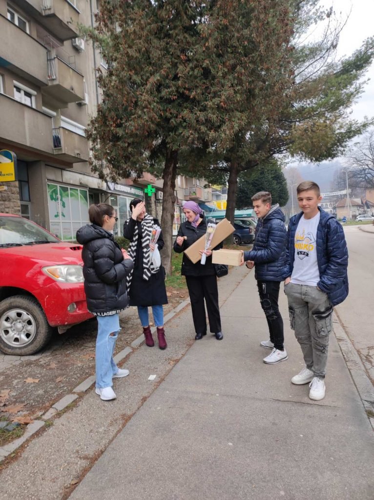 Mladi volonteri su na ulicama Novog Travnika slučajnim prolaznicama dijelili cvijeće i prigodne poklone sa motivacijskim porukama.