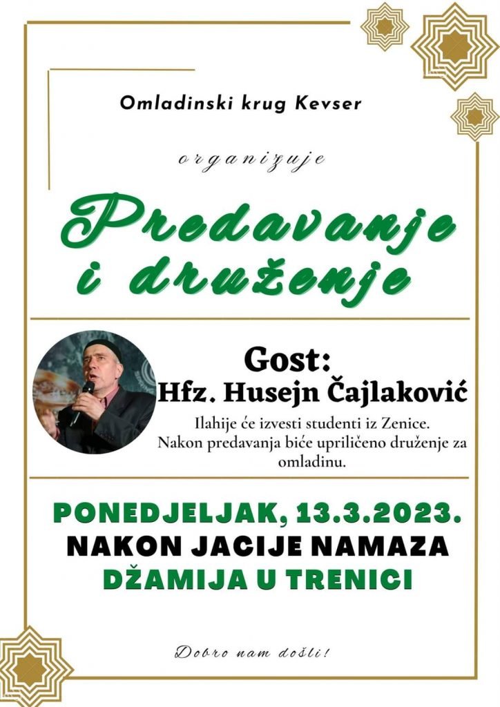 U ponedjeljak 13.3. poslije jacije namaza održat će se predavanje, a gost predavač bit će hafiz Husejn ef. Čajlaković.