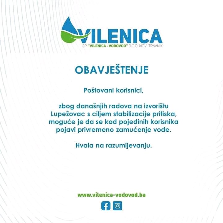 Vilenica-Vodovod: Obavijest o mogućem privremenom zamućenju vode