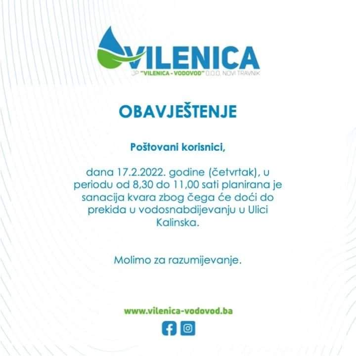 Obavijest iz Vilenica-Vodovod u vezi prekida vodosnabdijevanja u ulici Kalinska.