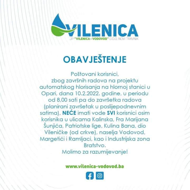 Važna obavijest iz Vilenice-Vodovod o prekidu vodosnabdijevanja za 10.02.2022.