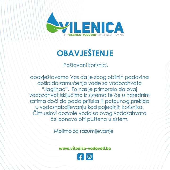 Vilenica-Vodovod: Važna obavijest za sve korisnike