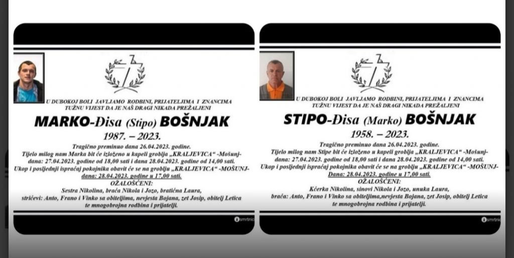 Dana 26.04.2023.godine oko 11,15 sati u PS Vitez je prijavljeno da u mjestu Mošunj, općina Vitez iz jedne porodične kuće izlazi veća količina dima. Odmah po zaprimanju prijave na lice mjesta izašli su službenici policije koji su potvrdili navode prijave, kao i službenici Hitne pomoći i vatrogasci. Prilikom ulaska u navedenu kuću, u istoj su zatečena dva beživotna tijela, radi se o Stipi Bošnjak rođen 1958.godine i Marko Bošnjak rođen 1987.godine, obojica iz Viteza, koji su tu stanovali.