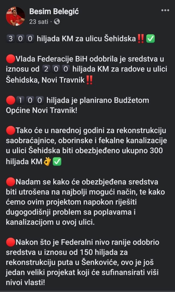 Ovu informaciju potvrdio je Besim Belegić, šef kluba vijećnika SDP-a u Općinskom vijeću Novi Travnik. Pored ovih 200 hiljada, Budžetom Općine Novi Travnik planirano je još 100 hiljada KM.
